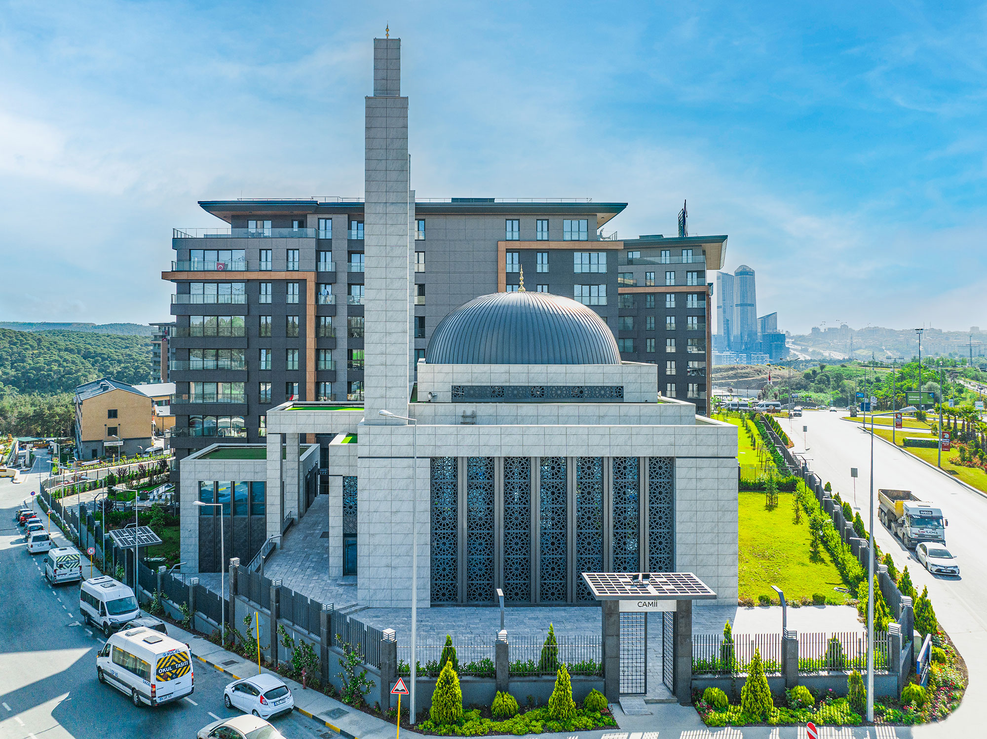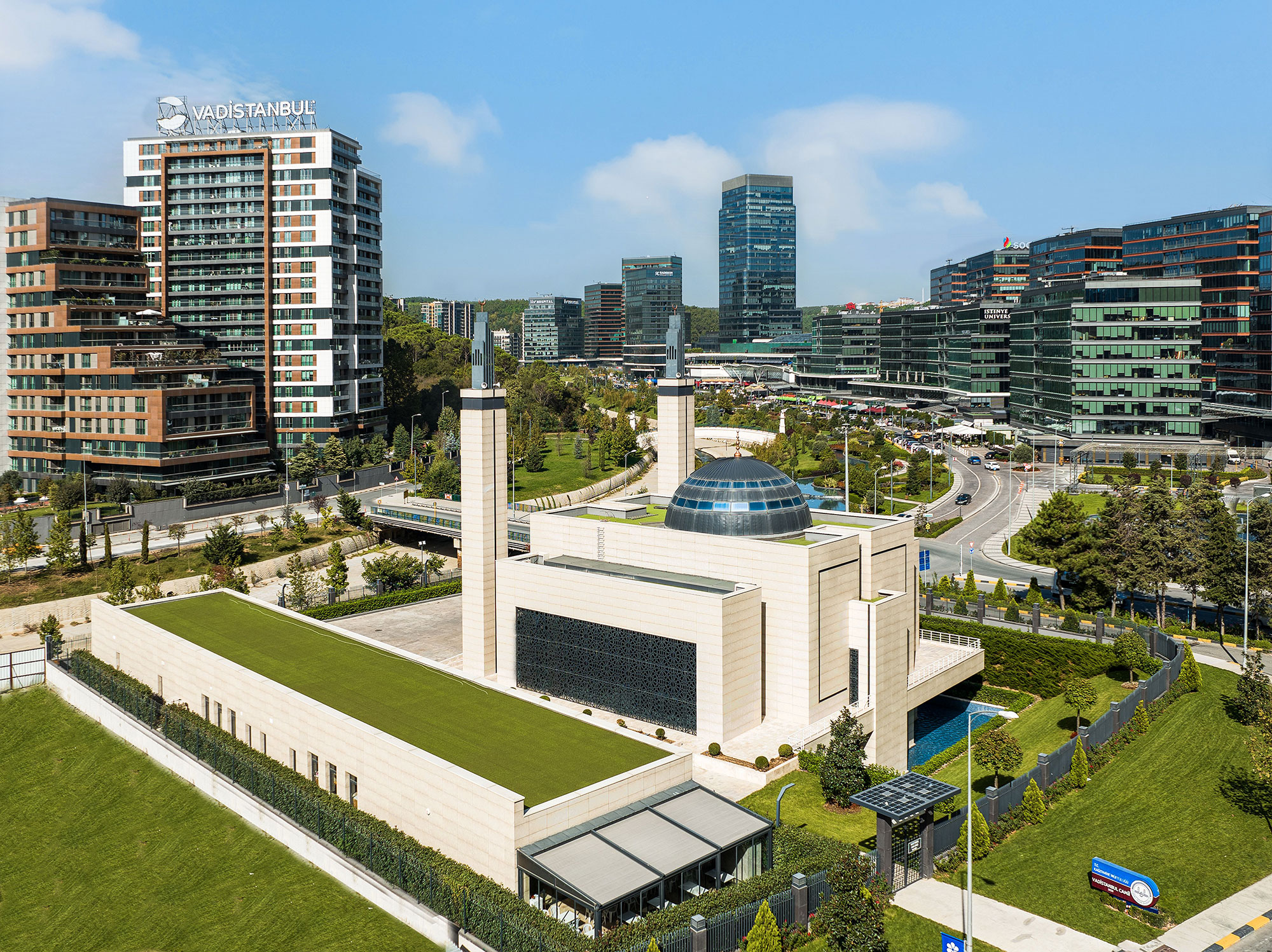 Vadistanbul konut projesinin yanı başında inşa edilmiştir. Modern bir mimariye sahip caminin tasarımı Allah lafzından yola çıkılarak gerçekleştirilmiştir. Minarenin uç kısmındaki 5 yapısal eleman İslam’ın 5 şartını temsil etmektedir. Cami yanında kütüphane ve kuran kursu olarak hizmet veren ayrı bir binanın yer alması burayı külliyeye dönüştürmektedir.