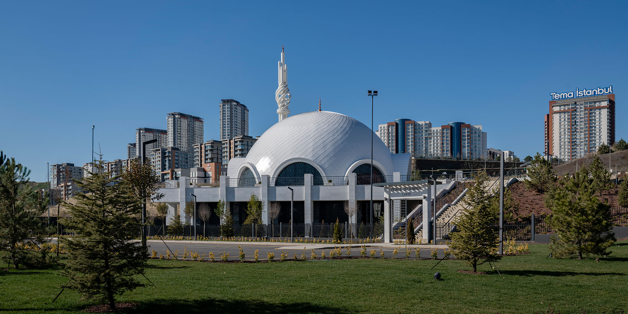 Tema İstanbul konut projesinin yanı başında inşa edilmiştir. Modern bir mimariye sahip caminin ana formunu en etkin camii simgelerinden biri olan kubbe oluşturmuştur. Minarede yer alan sarmal 5 yapı İslam’ın 5 şartını simgelemektedir.